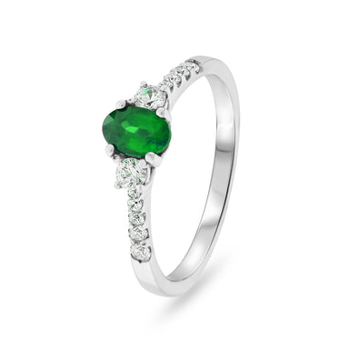 Oval Centre Gemstone 6mm x 4mm with a single brilliant cut diamond either side c.0.05ct each, and diamond set shoulders. Total Diamond Weight c.0.2...