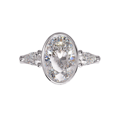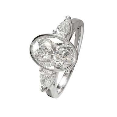 A timeless 3 stone lab diamond ring symbolizing past, present and future love, featuring an oval cut and pear cut diamond with mixed rubover and cl...