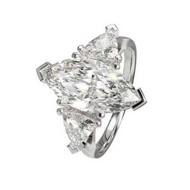 A timeless 3 stone lab diamond ring symbolizing past, present and future love, featuring a marquise cut and trillion cut diamonds with mixed corner...